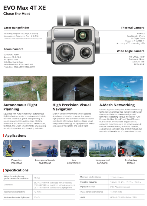 The drone introduces the industry's first A-Mesh networking system, allowing multiple devices to connect freely for seamless air-to-ground network coverage. With a cutting-edge sensor fusion system combining binocular fisheye vision and millimeter-wave radar, the EVO Max 4T XE delivers full 720° obstacle detection and avoidance, making it ready for all-weather missions.